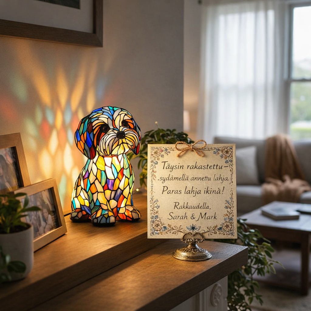 Tämä käsintehty lasitaidelamppu yhdistää kauniin värilasin, pehmeän valon ja kodikkaan tunnelman ajattomaksi sisustuselementiksi. Lampun lämmin ja rauhoittava hehku luo heti kutsuvan ilmapiirin olipa se yöpöydällä, senkillä tai olohuoneen hyllyllä. Se sopii täydellisesti hetkiin, jolloin haluat kotiisi lisää rauhaa ja lämpöä.
